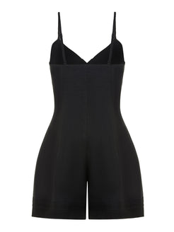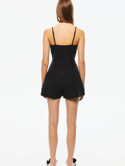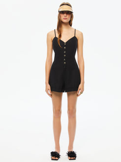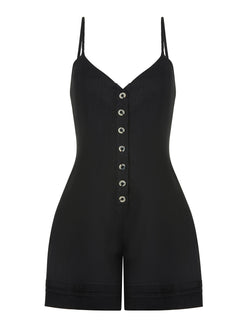 Wide-leg linen mini jumpsuit with zipper and button closure, adjustable thin knit straps, and lining