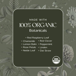 Organic and/or wildcrafted: Raspberry Leaf, Red Clover, Oat Straw, Chamomile, Lemon Balm, Fennel, Nettle, Rose Petal
