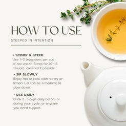 Steep 1–2 tsp per cup in hot water for 5–10 minutes. Enjoy daily during your menstrual cycle or as needed for support and comfort.