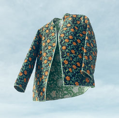 The Nancy is a dreamy quilted reversible jacket made from our special prints so both sides have excitement. This mid length piece has a boxy silhouette, with a mandarin collar and patch pockets thoughtfully placed for perfect reversibility. It features a fully buttoned-up closure and binding edge finishes