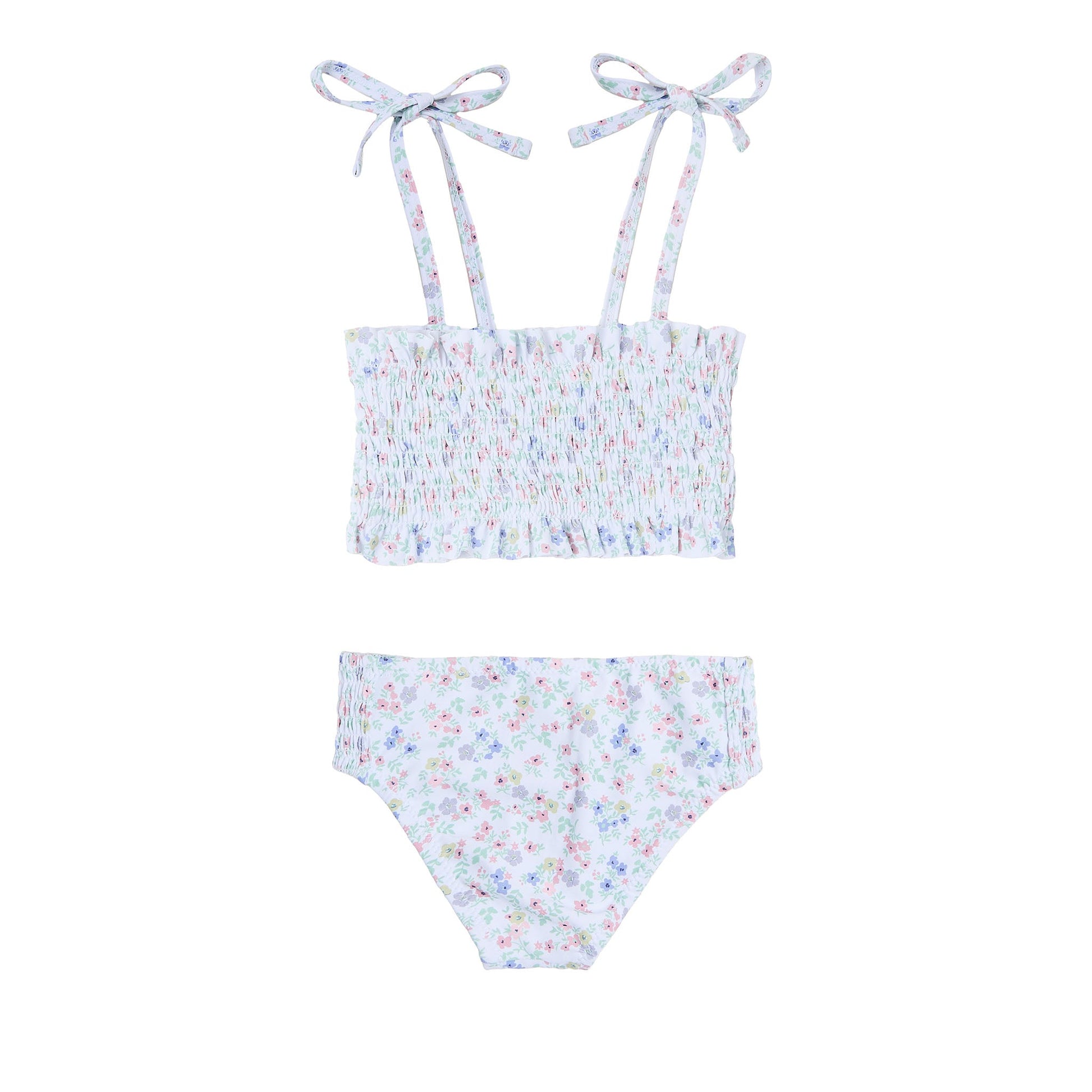 Two piece tankini set in exclusive floral print with smocking top and adjustable spaghetti tie straps. Matching bottoms with smocking at hips. UPF50+ and quick dry capacity. Composition: Recycled 80% polyester, 20% elasten.