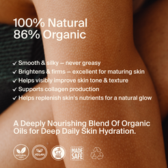 Organic jojoba oil, organic argan oil, organic sesame oil, olive squalane, vitamins A, C, and E, and natural essential oils.