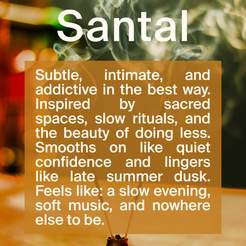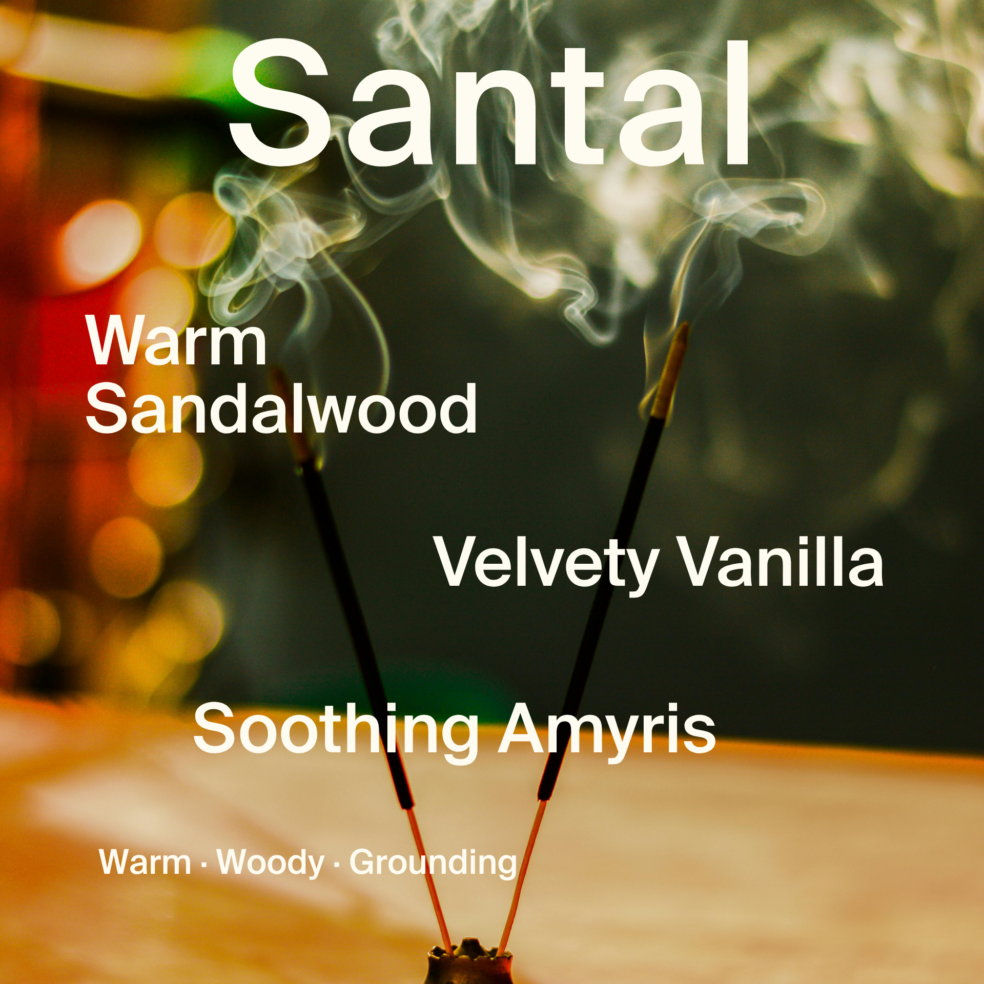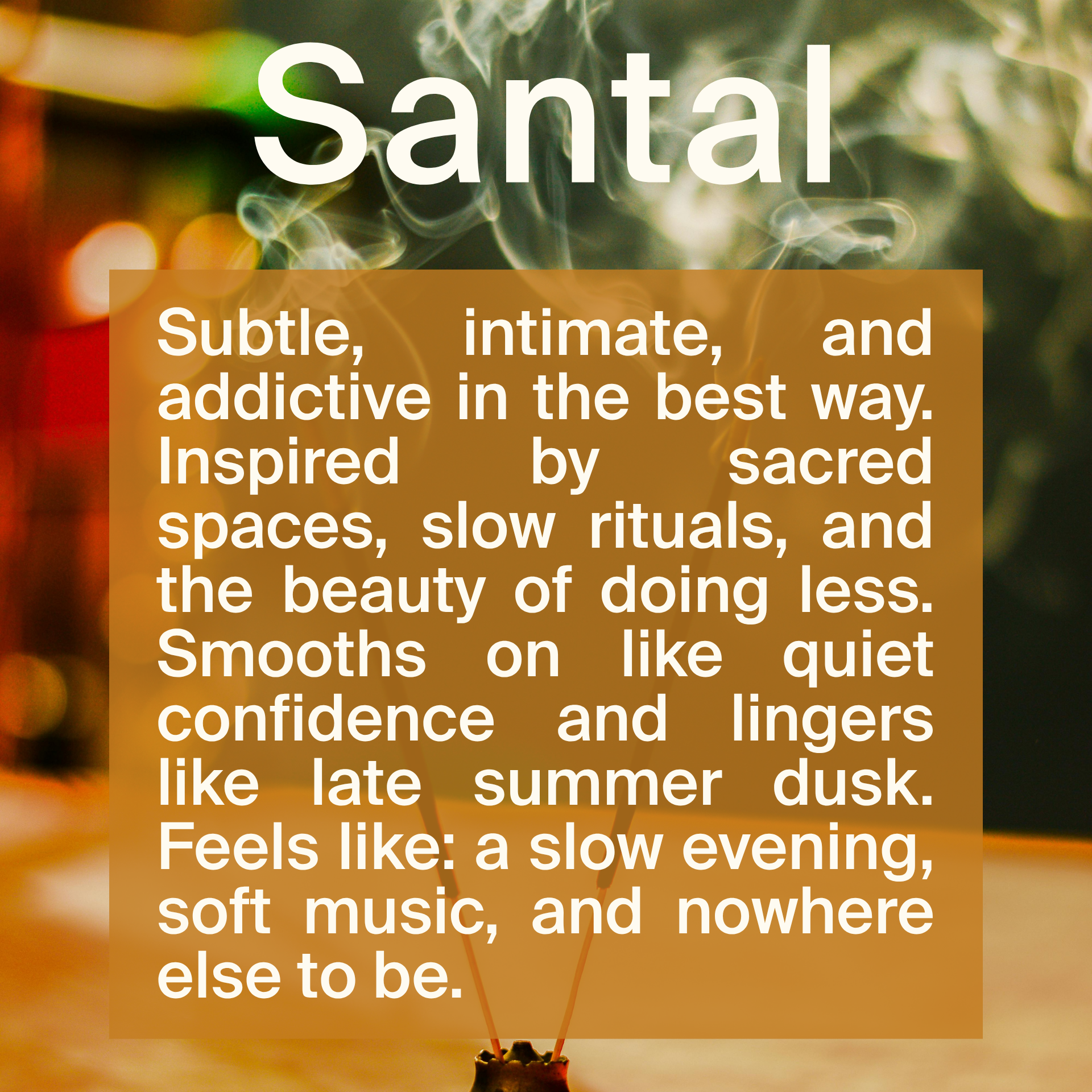 Santal Signature Scent: A warm, woody blend of creamy sandalwood, soft amber, and sunlit vanilla. Sensual yet serene — reminiscent of slow mornings, grounding rituals, and sun-warmed skin.