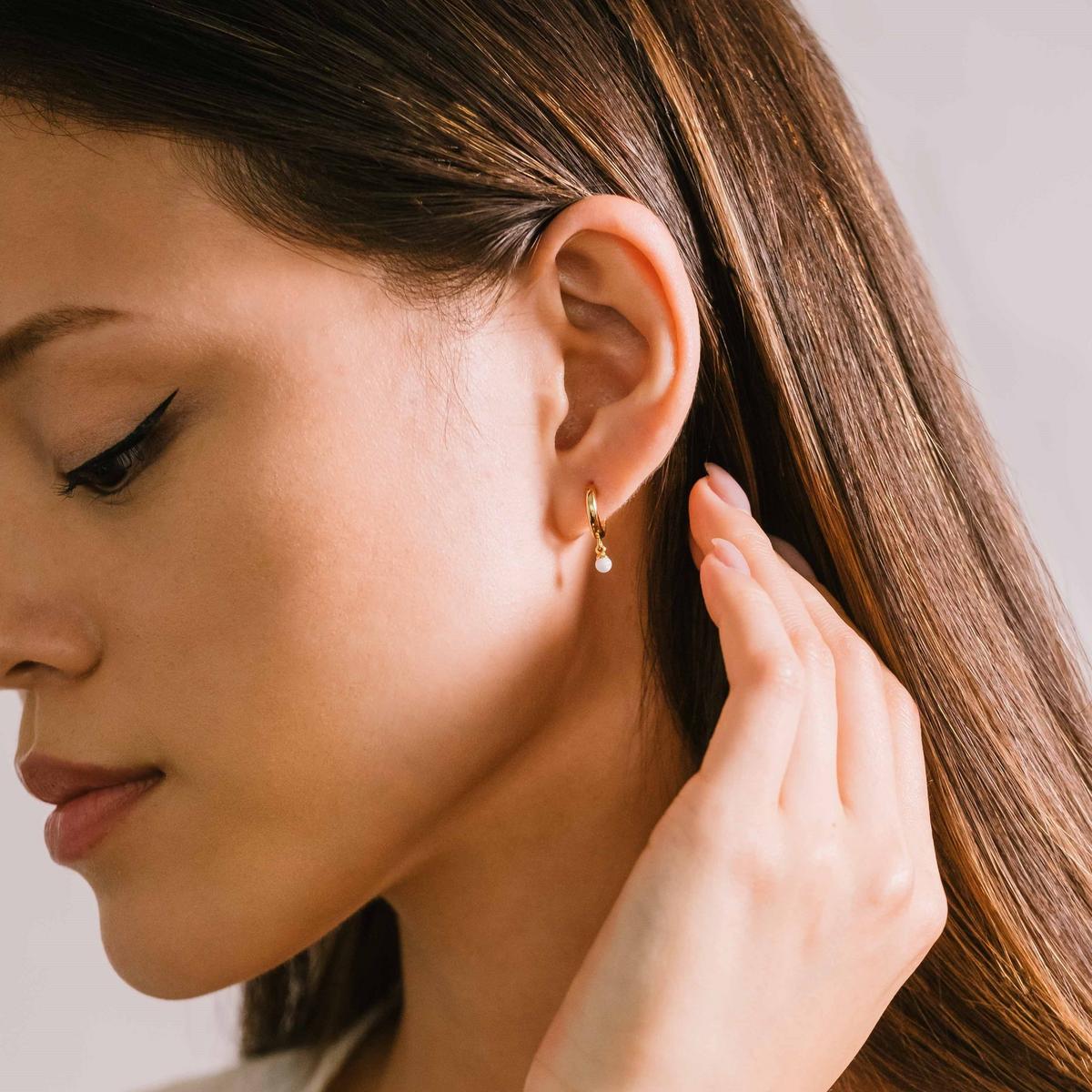 A gold-plated hoop with a tiny opal dangling from the centre. Made from responsibly sourced and recycled sterling silver, these minimalist hoops are delicate on you, and the planet.