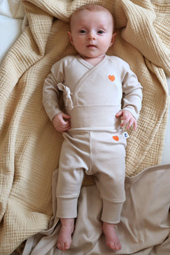 This baby kimono body is designed to keep your little one safe and comfortable. The soft, breathable fabric is made from premium 100% organic Pima cotton, free of any toxic chemicals or dyes, so you can be sure your baby is safe and sound. The body features an embroidered heart at the chest, as well as built-in mittens at the sleeves to keep your baby's hands warm. The perfect piece to bring home your newborn in, this kimono body is sure to be a hit. You can also purchase it as part of a whole gift set, which includes a hat, blanket and booties to complete the look.