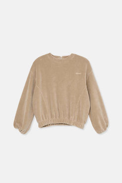 Velvety soft, warm, organic sweatshirt. Round neckline and snap buttons at back. Dropped shoulders and puffed sleeves. Embroidered detail.
