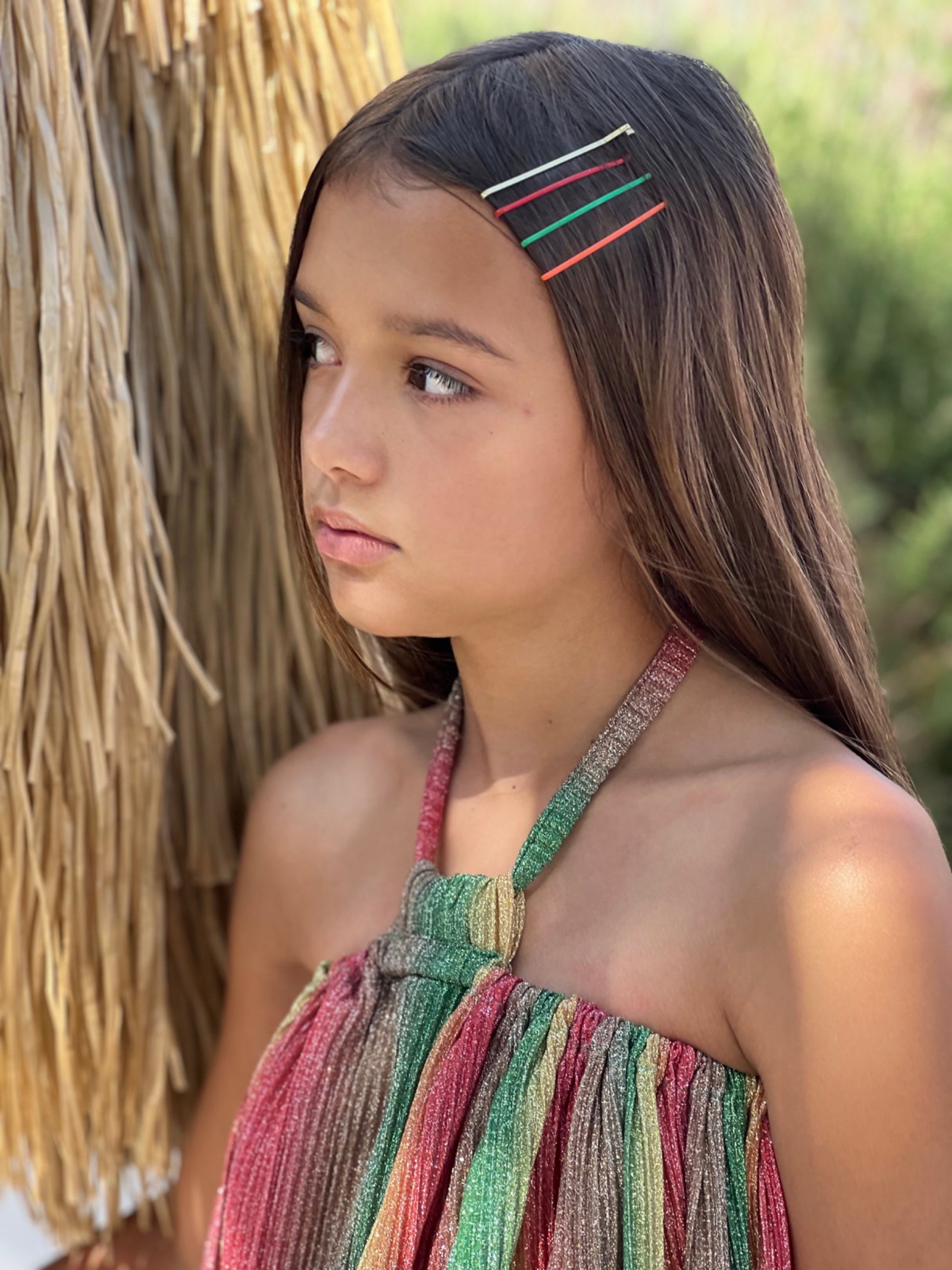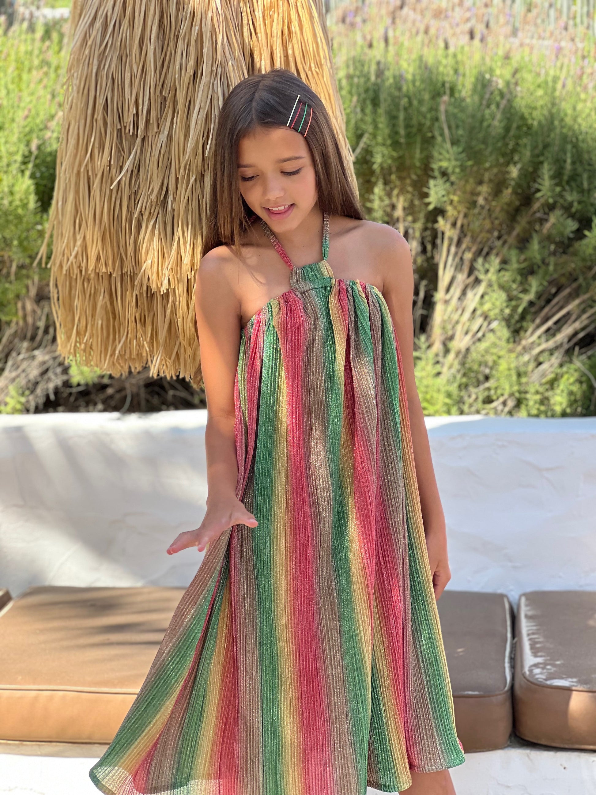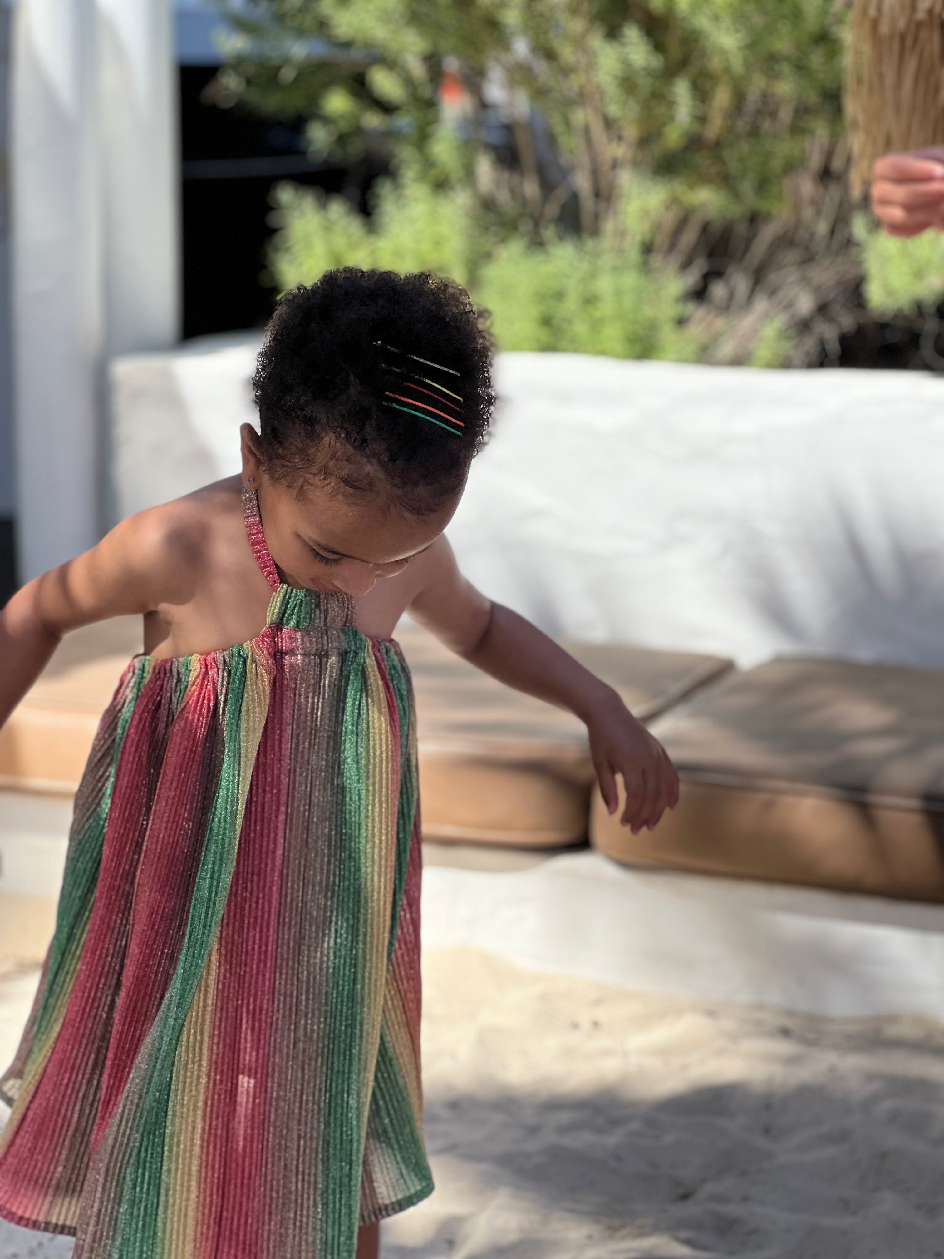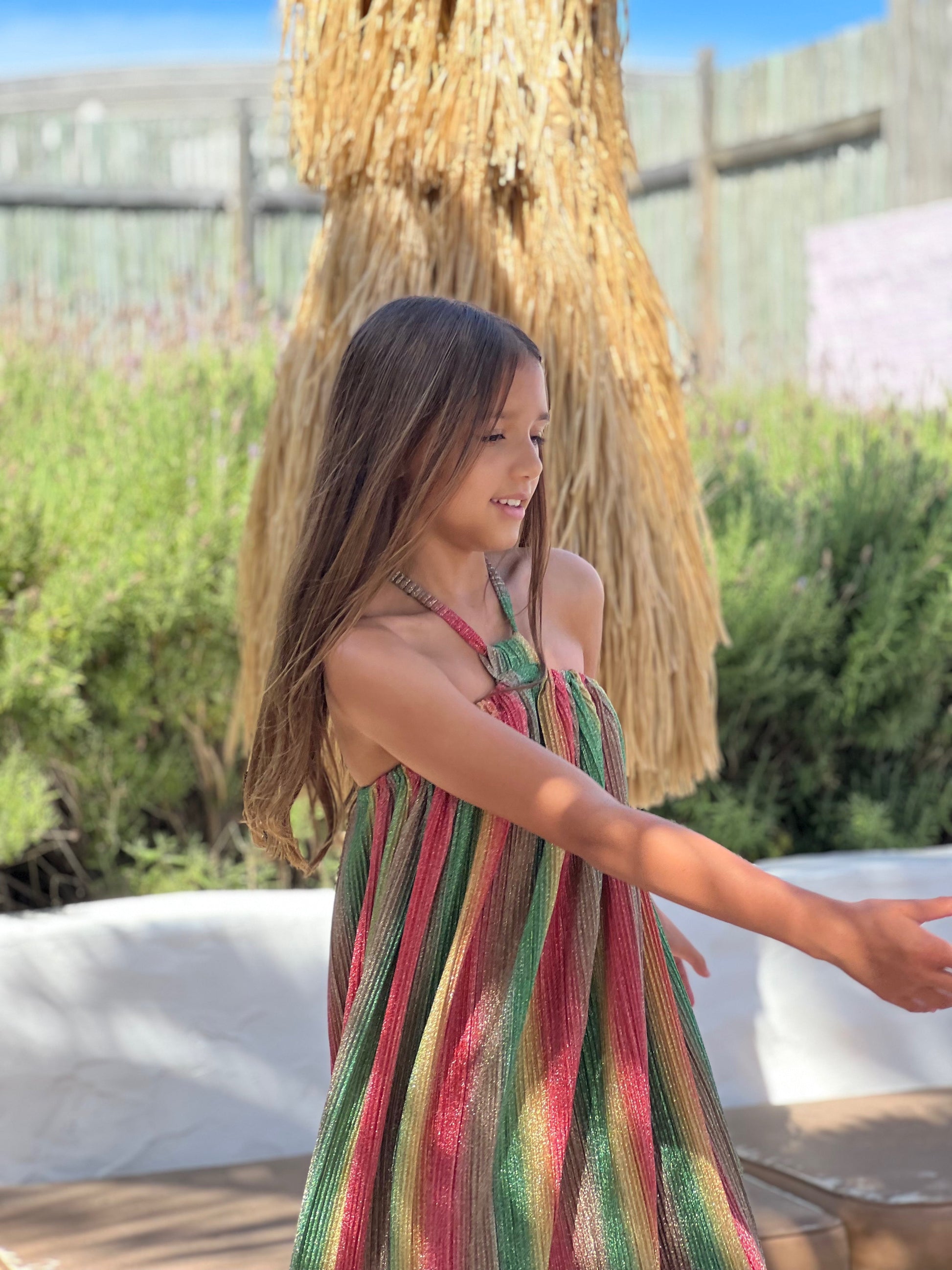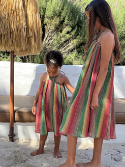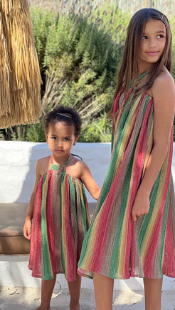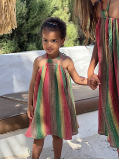 Our Red Rainbow Halter is the prettiest shimmer of whimsical rainbow you will ever see. Perfect for our vacation bold little girls that are inlove with everything shimmer. It's soft and flowly making it the prefect play and dress up dress.