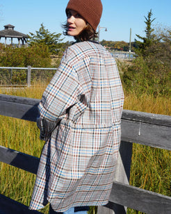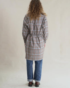 Crisp, heavy weight cotton plaid makes a transitional piece that doubles as a jacket and dress for all weather. Sport elements converge with a feminine spirit for the perfect timeless investment. In-seam pockets, Drawstring adjustability. Unlined length from shoulder to hem=39" 100% cotton S/M, M/L