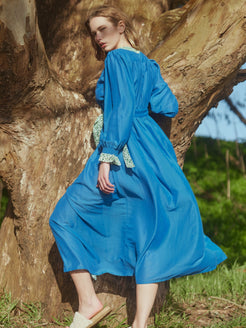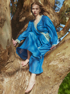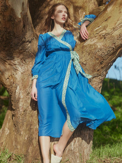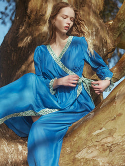 Introducing The Rachael Midi Robe - an easy lounging essential. Crafted from cotton voile, this midi robe wraps you in airy softness. Adorned with green floral detailing on the chest trims, ties, and cuff of the sleeve, its romantic bracelet sleeves and smocking detailing exude timeless femininity. With a flattering wrap front and attached waist tie, adjust to your comfort. Complete with a flattering wrap front and adjustable waist tie, it's designed to fit you just right, ensuring your utmost comfort and style.