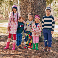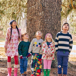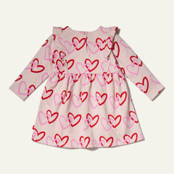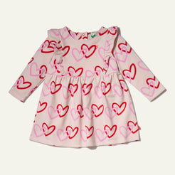Our Baby Ruffle Dress features a non-toxic multicolored heart print made from the softest recycled cotton and recycled plastic fabric. Designed with long sleeves, a high waist flared skirt, and snap buttons in the back for easy dressing and a touch of whimsy. Whether they pair it with leggings for added warmth or wear it on its own, this dress is a versatile and essential choice for cool weather days. Crafted from the world's softest recycled cotton and recycled plastic fabric, it's a dress that celebrates both style and sustainability. Made in Portugal.