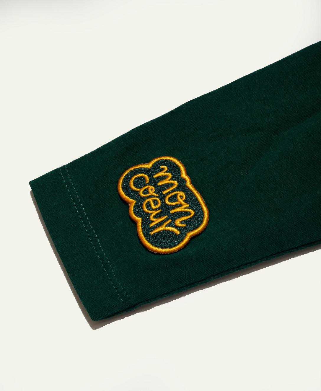 Pine green long-sleeve t-shirt with a skateboarding dog on the front, made from the softest organic and upcycled cot...