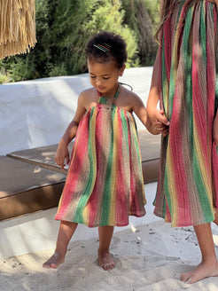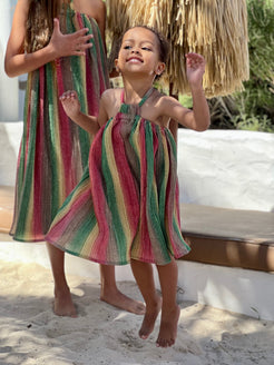 Our Red Rainbow Halter is the prettiest shimmer of carribean rainbow you will ever see. Perfect for our vacation bold little girls that are inlove with everything shimmer. It's soft and flowly making it the prefect play and dress up dress.