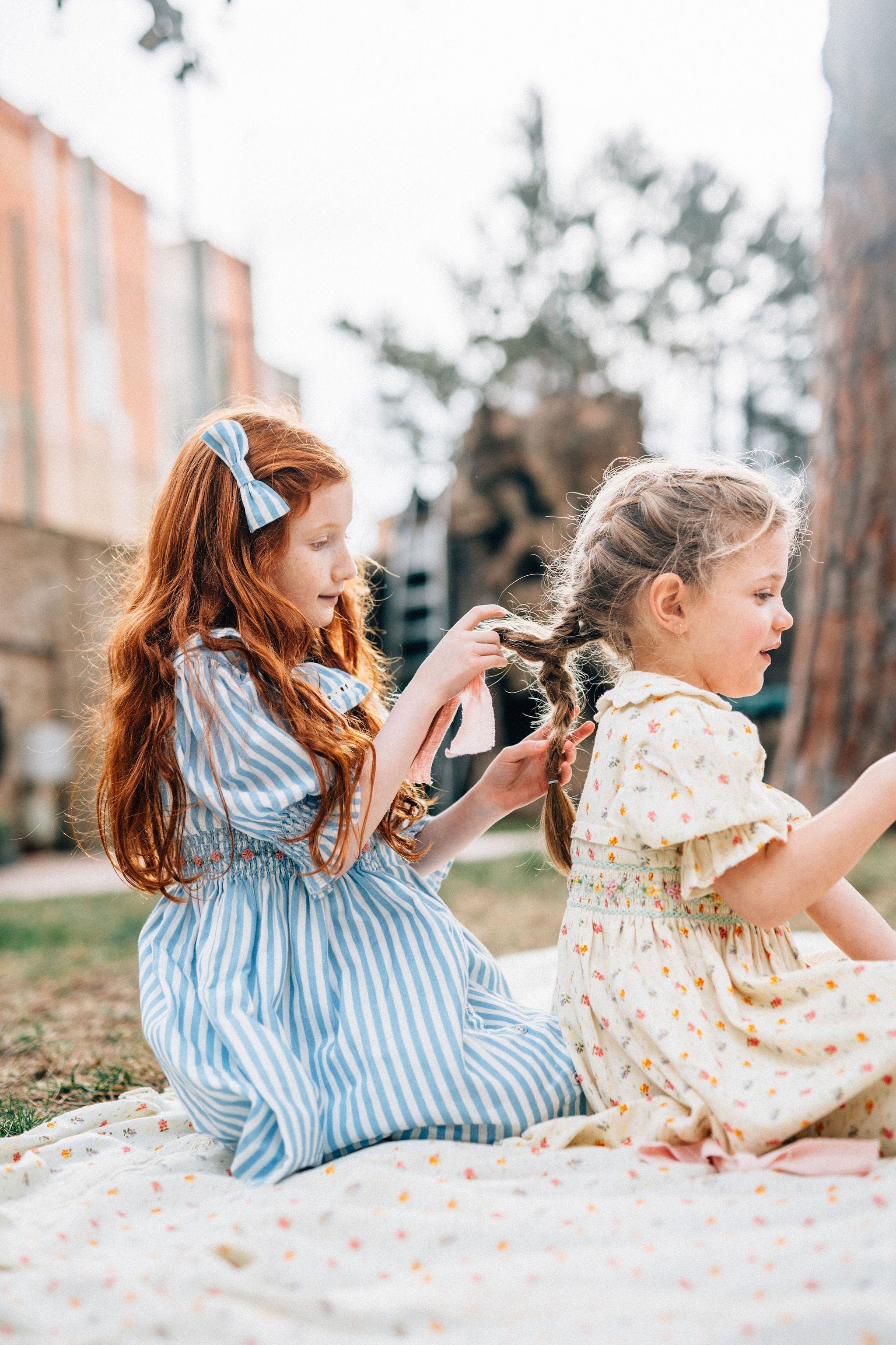 Rosalie, the little retro dress, is presented here in a beautiful blue Deauville striped and ecru fabric. Its ruffled collar adorned with an insertion embroidery adds a refined detail. Its blue smocking and hand-embroidered dahlia pink flowers make it unique. This is the little dress you remember years later. Timeless, it can be passed down. Rosalie is fully lined.