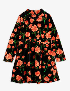Black kids' velour dress with Rose print made from GOTS certified organic cotton velour.