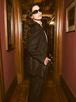 Meet Sloan. A blazer inspired by that one you stole from your ex. Accented shoulder pads, a boxy, hyper-relaxed fit. The perfect finish to a chic tailored pant moment or thrown over a party dress. Embellished with lurex pinstripes adding subtle sparkle.