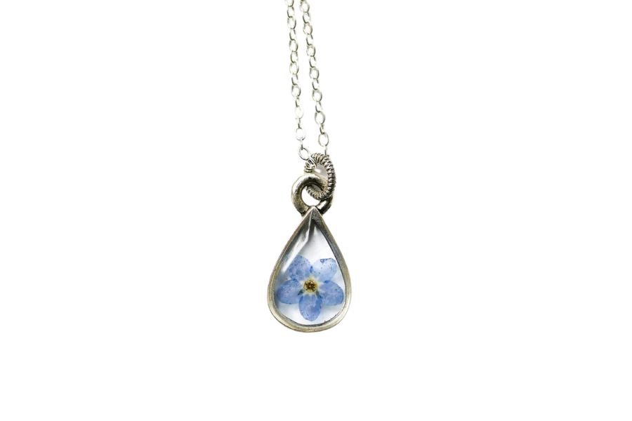 The Small Teardrop frame is a minimal and classic piece. Available with a single Forgetmenot flower. The Forgetmenot is a symbol of lasting friendship, love and remembrance. Chain is 18” long silver plated brass. Ships in a gift box. The symbolism of the botanical is printed on a tag that is attached to your jewelry. Materials are tarnish resistant. All materials are nickel and lead free.