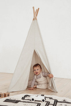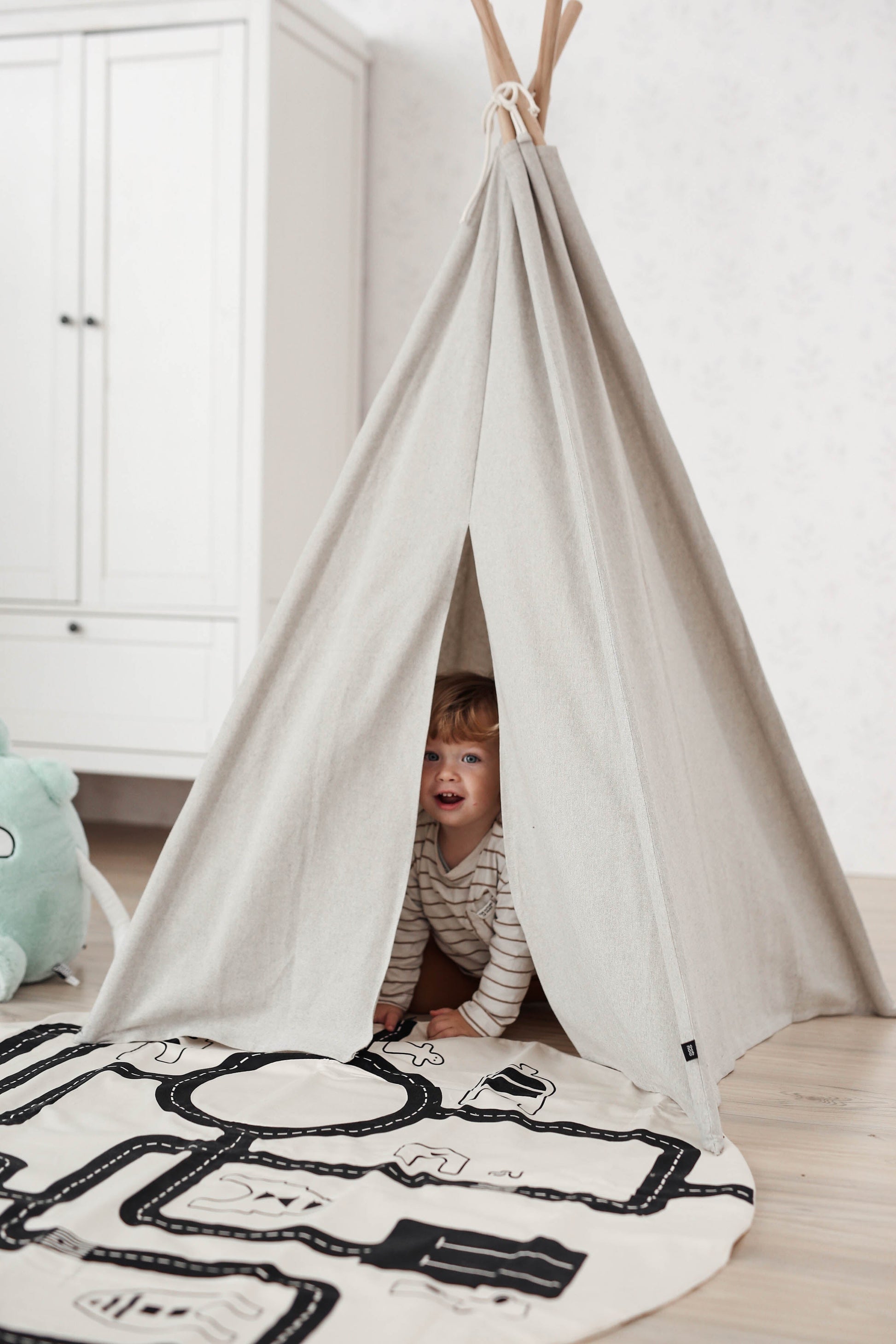 Putting up the Teepee tent will open a passage between this world and a parallel one. Be aware that when your little one enters the tepee, they will enter the world of yesterday, of tomorrow, the world of fantasy where they will meet their fairy tale friends, have an afternoon tea with them or will embark on an adventurous journey. Just in case they don’t get lost, we have included a little bell in our set of wooden hanging pendants. Just ring the bell and your little one will return from wherever they were exploring. This little tepee play tent is a younger and smaller brother of our spacious ooh noo play tent. Because regardless of whether we have a small or big apartment, we all need a space of our own. Height 125 cm, width 100 cm, length 100 cm