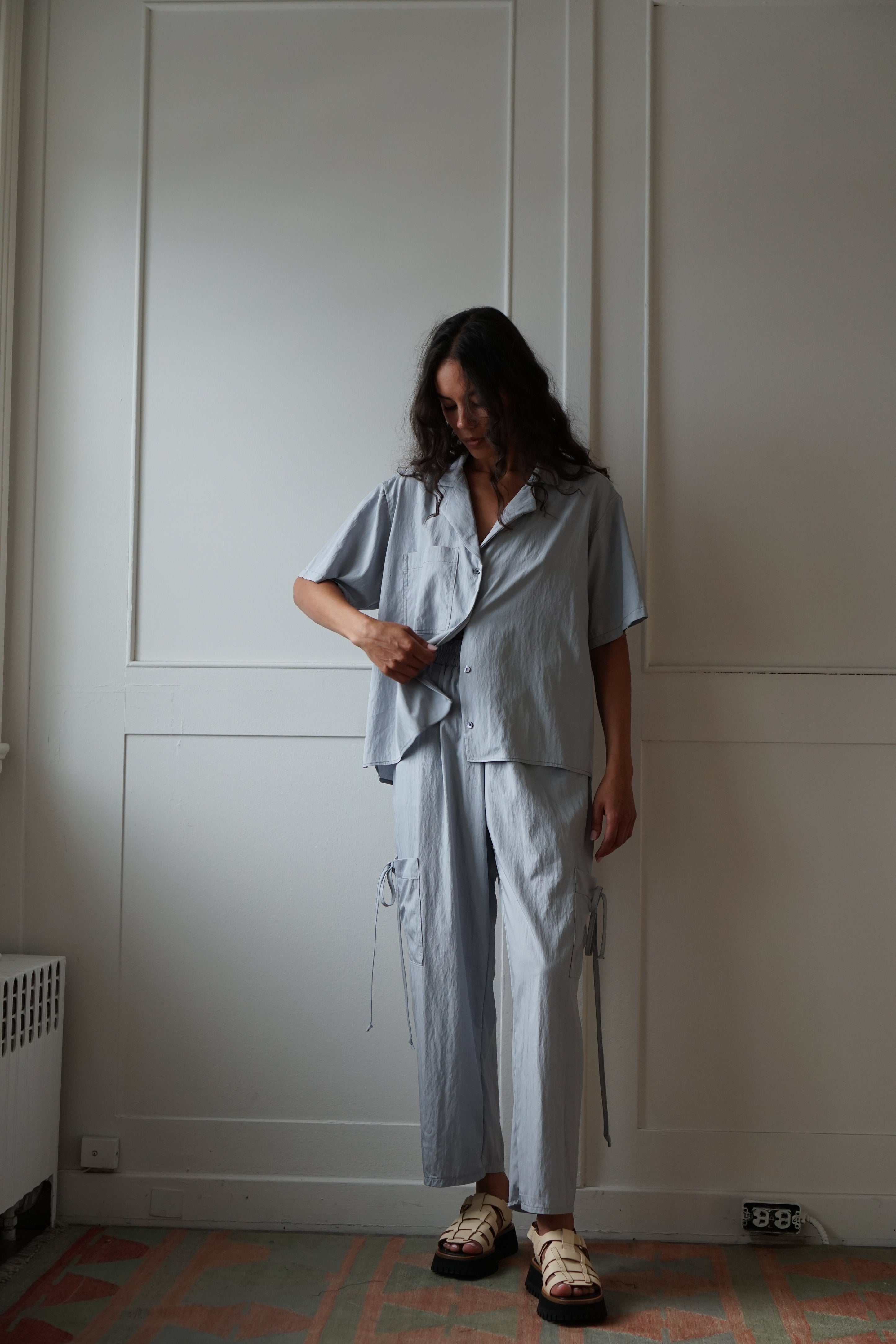 Meet your new best friend. Silky water wick fabric has the perfect “swoosh”. Femininity meets utility in our cargo pocket pant. Featuring an elastic waist band, large scale self tie pockets and inseam pockets. Pale slate blue color goes with everything in your wardrobe to dress up or down.