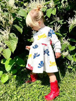 A cute easy dress for all day play! Fuller, with a little extra swing, we love that this style is as easy as it is cute.