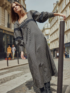 Adorned in black and khaki stripes, the Tara max is an easy, straight fit, caftan maxi dress. Square neck lined with crochet lace. Detailed with workable ties at the chest while still offering full bust coverage. Sheer lace detailing on the full length sleeve, finished with a soft pleated cuff.