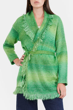 Introducing Tatiana. A fringe trimmed cardigan featuring a shawl collar and remove-able waist belt. Offering options to tie too close or leave relaxed and casual. Subtle shimmer is thoughtfully woven into this soft knit giving slight sparkle as the light hits you
