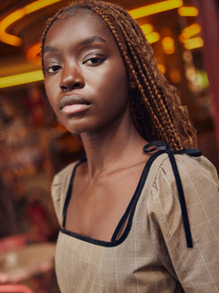 Meet the Tatum Dress. A square neck mini printed in a seasonal chocolate brown check print with subtle blue pinstripes. Black velvet adds soft detail to the neck line, waist, and cuff. An easy fit, finished with a playful bow on the shoulder. Pair with your favorite boots or tights and a flat for cooler weather.