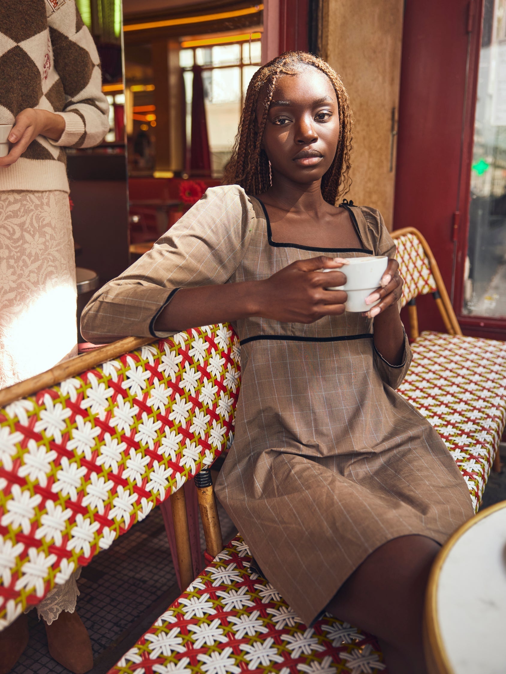 Meet the Tatum Dress. A square neck mini printed in a seasonal chocolate brown check print with subtle blue pinstripe...
