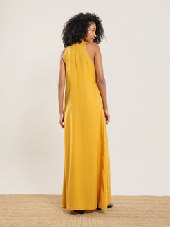 Minimal and sophisticated. Bold floorline maxi dress with halter neckline and troca shell keyhole button closure at t...