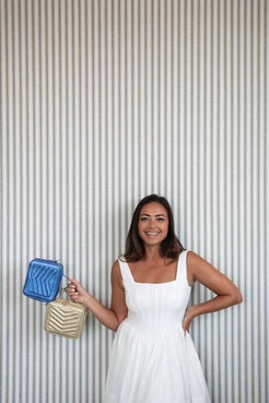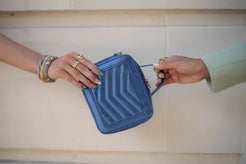 Combining iconic NYC and Charleston styles, our BARBY handbag in Ocean Blue is sustainable, made from recycled materials.