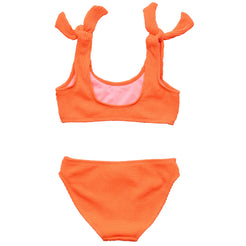 Bold, vibrant colors are all the rage this summer – a trend our Tangerine Tie Crop Bikini shows off to the max. The solid orange two-piece bathing suit is made of textured swimwear fabric, featuring ties at the shoulders. Get ready to vacation in style!