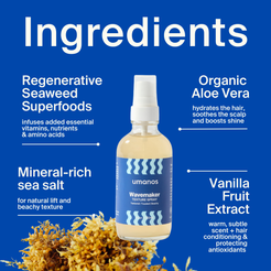 TheUmanos Wavemaker Texture Spray delivers the ultimate effortless hair — soft, touchable, and perfectly undone. This lightweight, non-aerosol texturizing spray is infused with five seaweed superfoods, hydrating aloe vera, and a hint of warm vanilla, creating weightless body and movement without crunch or residue.